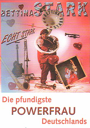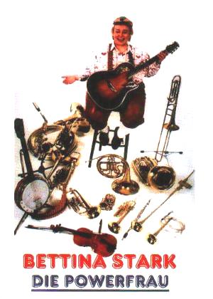 Deutschlands pfundigste Powerfrau, Bettina Stark mit über zehn verschiedenen Musikinstrumenten, von A wie Alphorn bis Z wie zwei Trompeten gleichzeitig, Kunstpfeifen und lustigen Liedern, ist eine Entertainerin der Spitzenklasse, die bei Alt und Jung ankommt.
